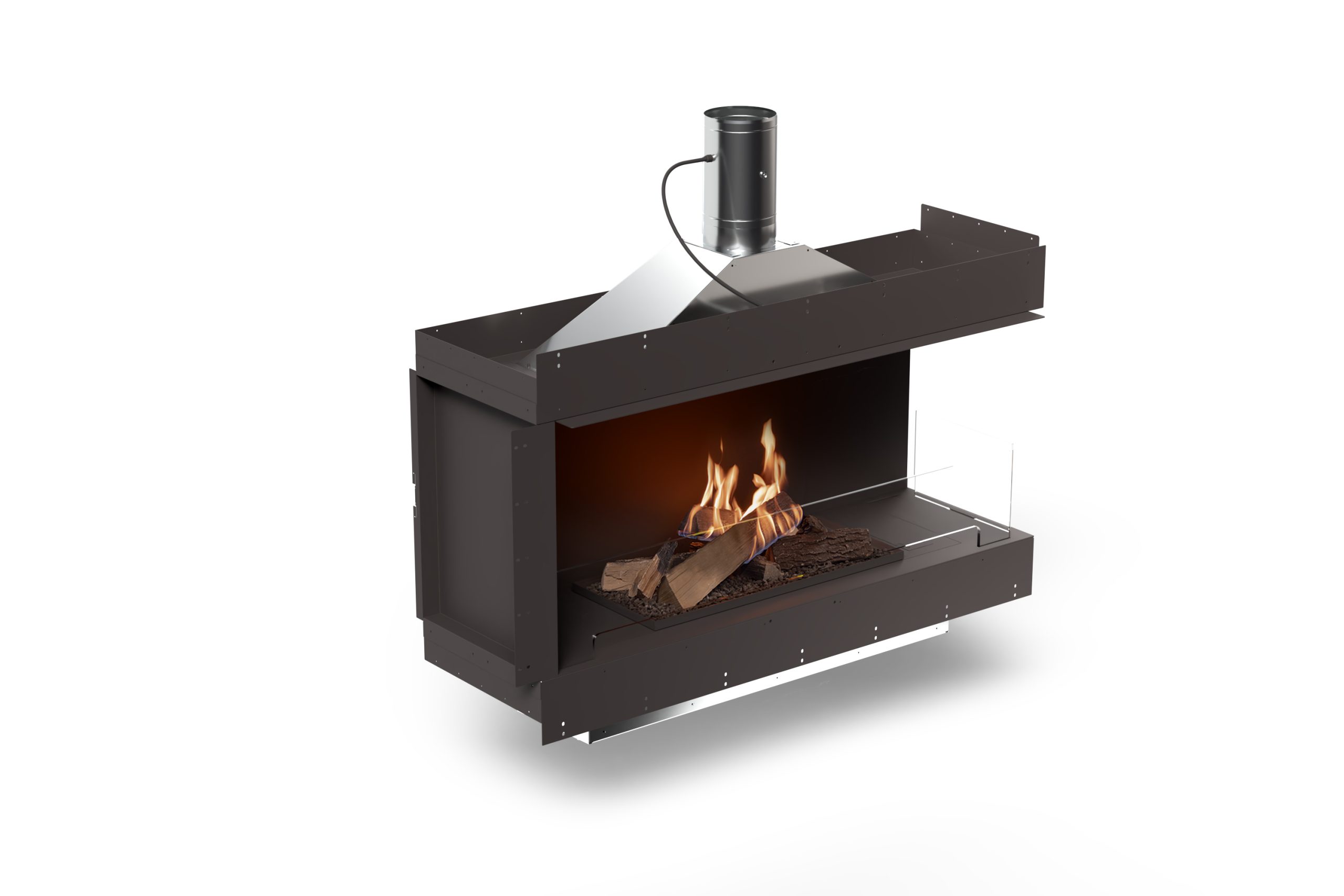 Questa soluzione consente l’integrazione completa del camino in pareti, elementi di arredo o strutture architettoniche — anche in configurazioni in cui un televisore è posizionato in stretta prossimità del focolare.